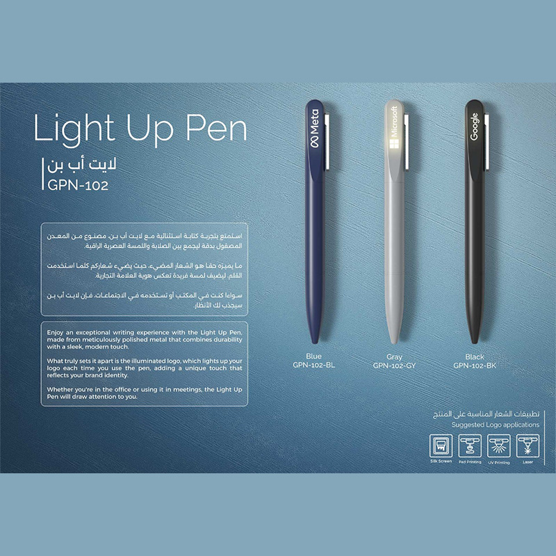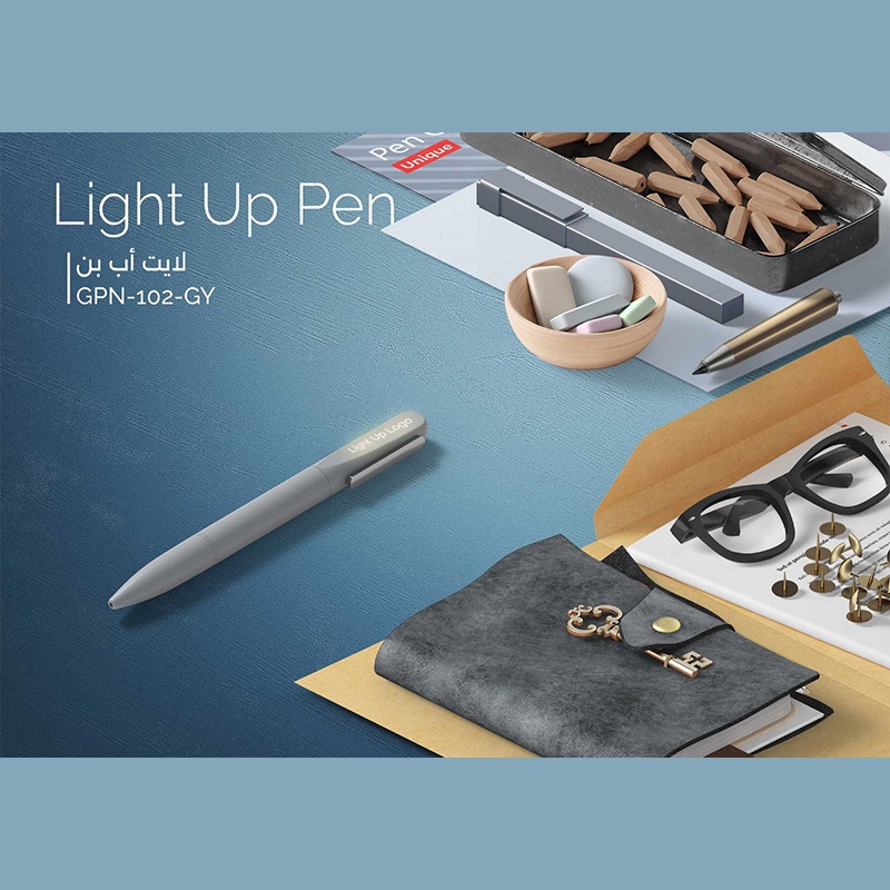 Light Up Pen Enjoy an exceptional writing experience with the Light Up Pen, made from meticulously polished metal that combines durability with a sleek, modern touch. What truly sets it apart is the illuminated logo, which lights up your logo each time you use the pen, adding a unique touch that reflects your brand identity. Whether you’re in the office or using it in meetings, the Light Up Pen will draw attention to you.