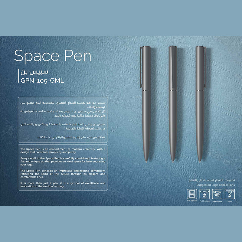 Space Pen The Space Pen is an embodiment of modern creativity, with a design that combines simplicity and purity. Every detail in the Space Pen is carefully considered, featuring a flat and unique tip that provides an ideal space for laser engraving your logo. The Space Pen conceals an impressive engineering complexity, reflecting the spirit of the future through its elegant and comfortable lines. It is more than just a pen; it is a symbol of excellence and innovation in the world of writing.