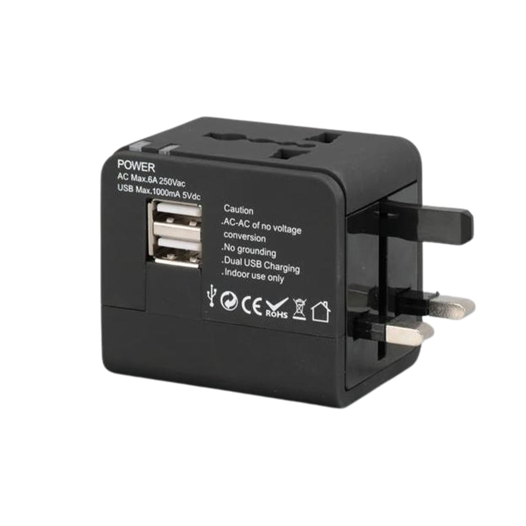 Travel Adaptor covering 4 global outlet types: US, EU, UK, AUS/CN and 2 USB-A output points. Promotional variety. Includes PU travel pouch, packed in a gift box.
